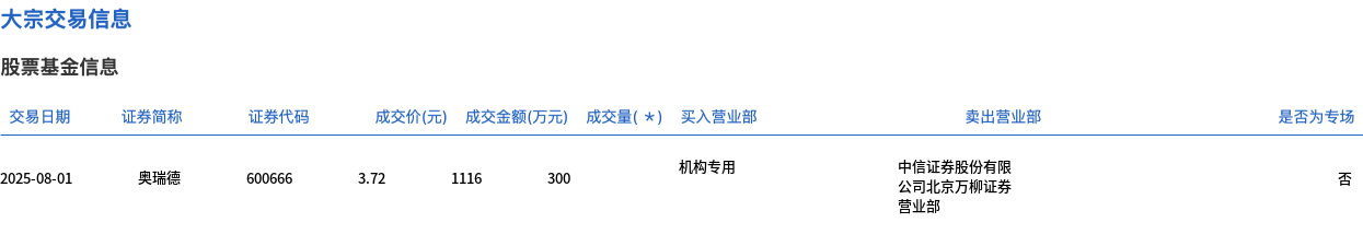 8月1日,奥瑞德大宗交易成交300万股,成交额1116万元,占当日总成交额的0.9%,成交价3.72元,较市场收盘价4.04元折价7.92%。