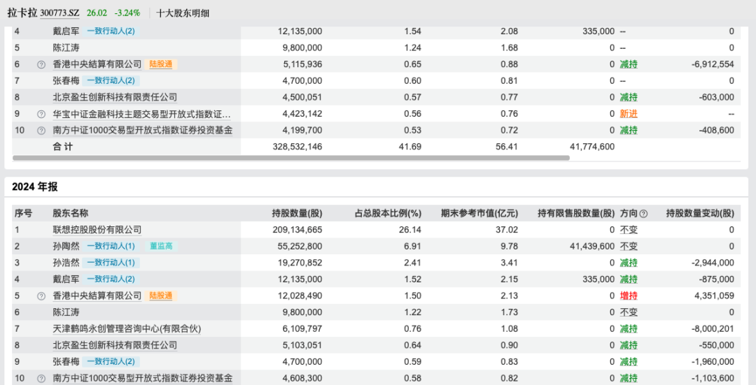 联想控股(3396.HK)于2025年7月23日至7月25日期间,通过集中竞价和大宗交易方式累计减持拉卡拉535.96万股,持股比例从26.54%降至25.86%。而根据既定计划,其未来三个月内可能继续减持3%拉卡拉股份。