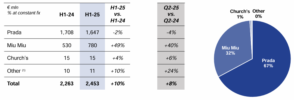 在Miu Miu增速放缓,而Prada品牌还在“拖后腿”的情况下,Prada集团2025年上半年营收按固定汇率增长9%,零售业务增长10%,保持在单位数及低双位数增长水平。