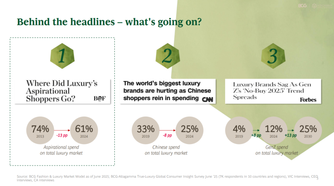这是自2008年金融危机以来首次下滑,主要由于宏观经济局势紧张、中国消费者需求下降,以及“向往型消费者”(指每年在奢侈品和服务上花费低于5000欧元的消费者)的减少。2013年,奢侈品市场中向往型消费者的比例为74%;2024年,这一占比下降至61%。