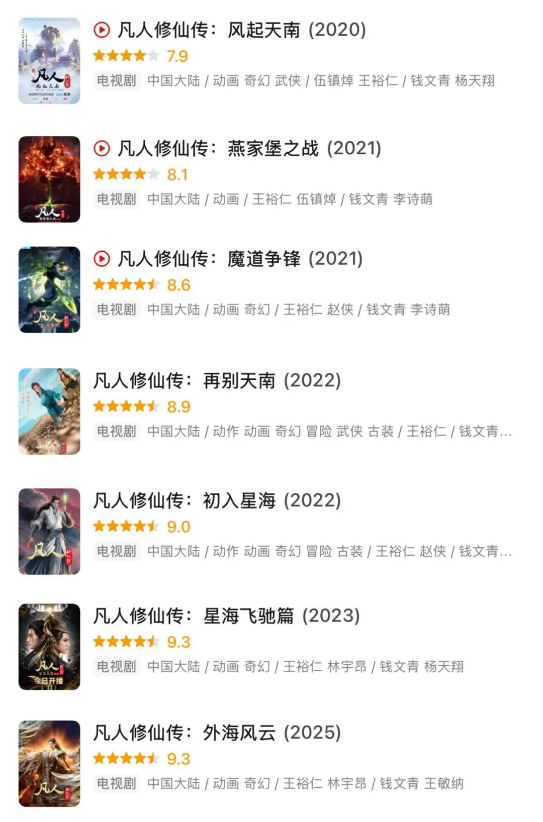 截至发稿,《凡人修仙传》B站累计播放量已直逼40亿大关,单集最高播放量破千万,追番人数近1200万。更值得称道的是,从开篇的《风起天南》到今年1月上线的《外海风云》,其豆瓣口碑不仅始终保持稳步上扬的态势,更达到了9.3高分。