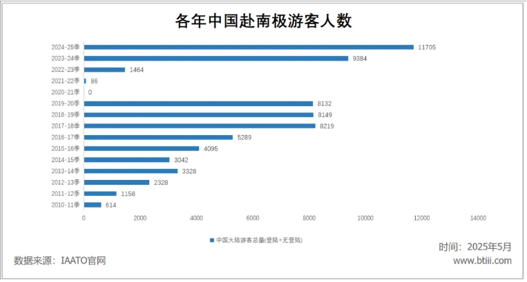 2024-2025年,赴南极旅游的中国游客数量达到11705人次,占当年前往南极全球游客数量10%,位居世界第二。