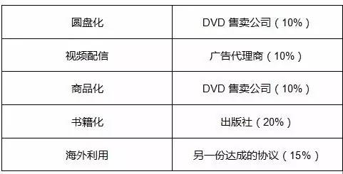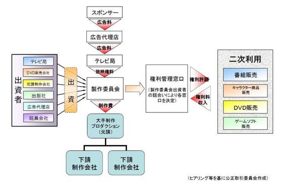 除了资金提供和风险共担,制作委员会的另一个作用,就是集中统筹,最终按照出资比例对所有的授权费用和收益进行提前分配。出资的赞助方一般包括电视台、电影公司、广告代理商、商社、出版社、新闻社、唱片公司、光盘录像带公司、艺能事务所、玩具厂商、网络媒体等企业。而各个产业链上的各家公司则根据自己的权利展开业务,通过二次利用谋取盈利。