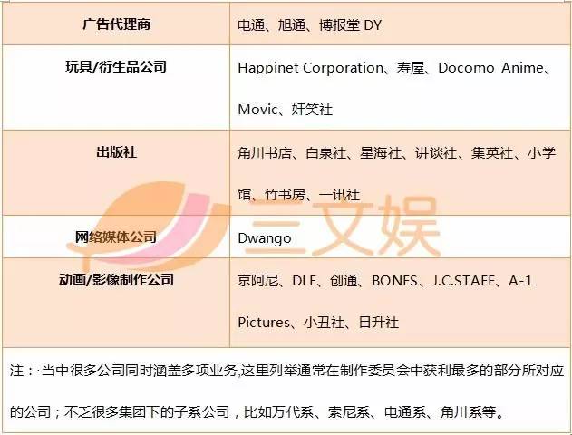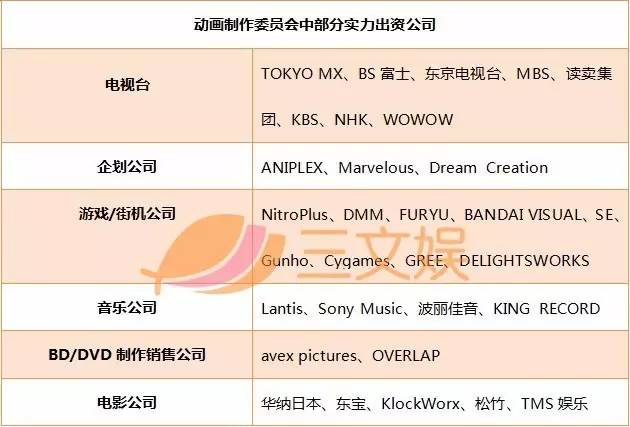 同时,近年也有越来越多的动画公司引进了制作委员会制度。先不论中国国情与日本制作委员会制度的契合程度,科普一下何为制作委员会吧。简而言之就是一部动画的组委会,由动画制片人牵头成立,主要由电视台、DVD/BD销售公司、广告代理商、衍生品/玩具厂商组成,如果有漫画原作,还将有出版社参与进来,由这些公司共同掏钱投资到动画项目当中。