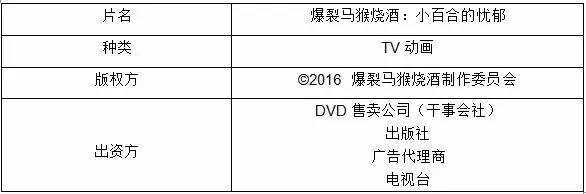 这些公司将共享《爆裂马猴烧酒:小百合的忧郁》的著作权。其中DVD售卖公司享有50%,出版社20%、广告代理商20%、电视台10%。那么相对应地,他们的二次利用权就涉及“地上波放送权、国内番组贩售权、海外番组贩售权、圆盘化权、动画配信权、商品化权、书籍化权以及海外利用权”。