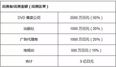 前面说到各个出资公司通过对作品的二次利用赚钱,而依据的标准就是各自的出资比率。三文娱这里引用日本专业网站livedoor上所举的架空案例,对制作委员会中各个公司的出资情况做进一步说明。