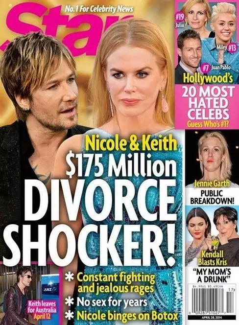 除了热点明星是八卦小报的掌中宝,据闪电调查,八卦小报最关系的话题还得是明星的各种“不幸婚姻”。秉承着“就是见不得别人好”的FF团心态,美国的八卦小报们接连整出: