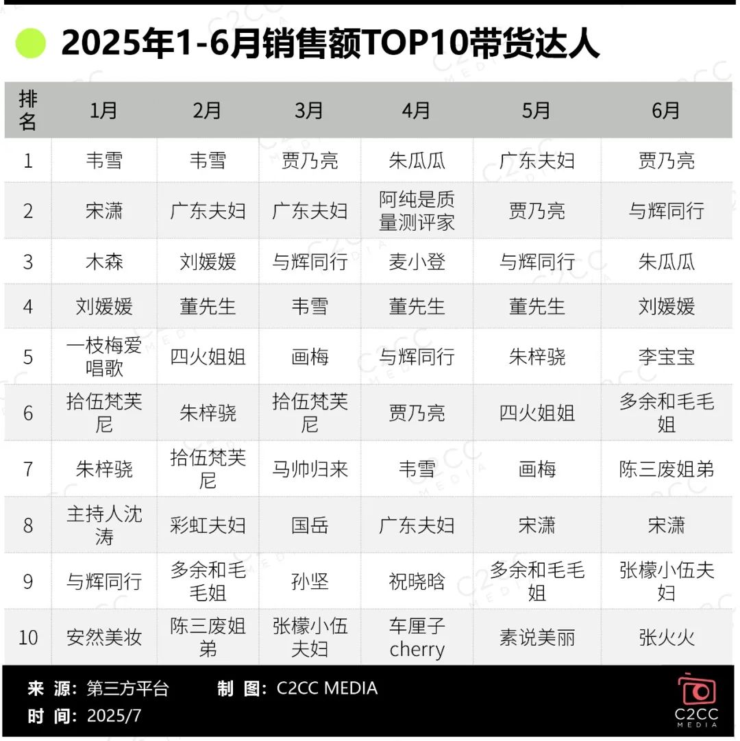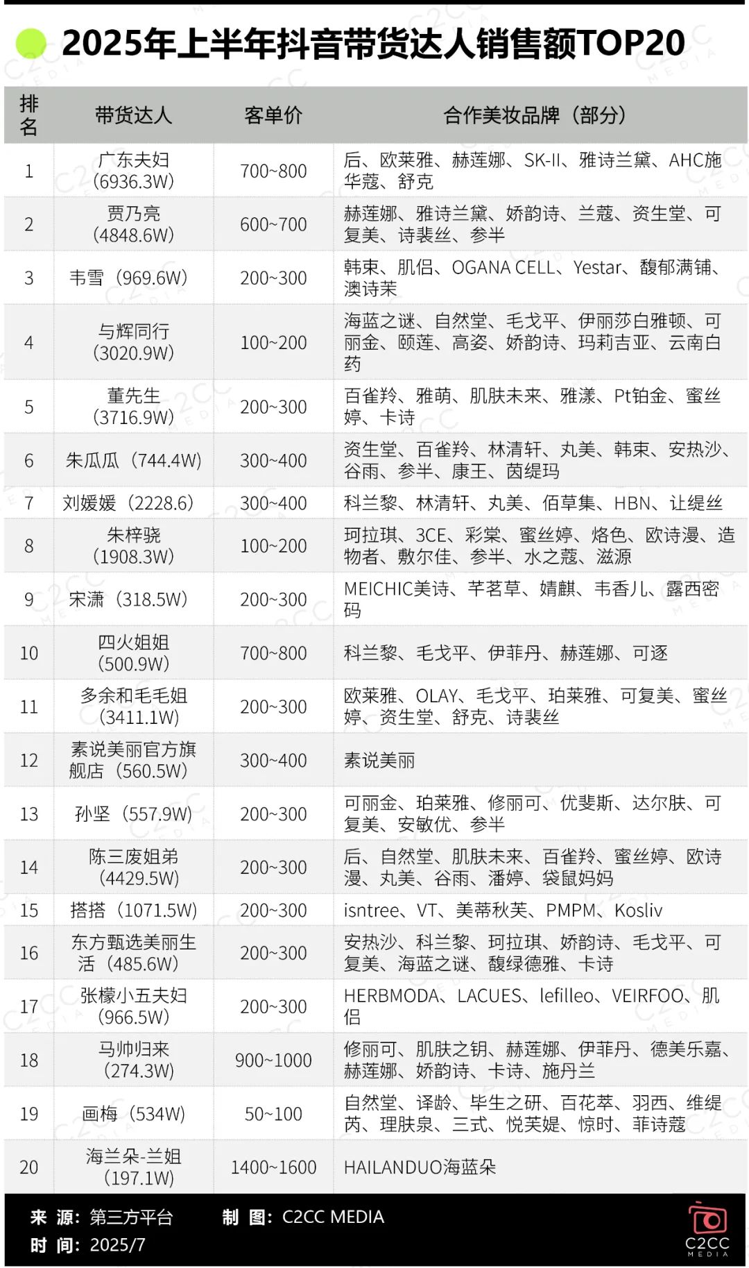 通过梳理2025年上半年抖音带货达人销售额TOP20,C2CC传媒X新妆发现上榜达人可分为超头达人(粉丝数1000W+)、头部达人(粉丝数500W-1000W)、肩部达人(粉丝数100W-500W ),分别是广东夫妇、贾乃亮、与辉同行、刘媛媛等9位超头达人,韦雪、朱瓜瓜、四火姐姐等7位头部达人,以及宋潇、东方甄选美丽生活、马帅归来、海兰朵-兰姐4位肩部达人。