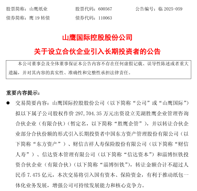 在合伙企业设立后,山鹰国际拟向中国东方资产管理股份有限公司(以下简称“东方资产”)、财信吉祥人寿保险股份有限公司、信达资本、淄博恒铁投资合伙企业(有限合伙)等长期投资者转让份额,转让金额合计不超过7.48亿元。与此同时,东方资产指定方将认缴出资100万元,作为普通合伙人加入合伙企业。