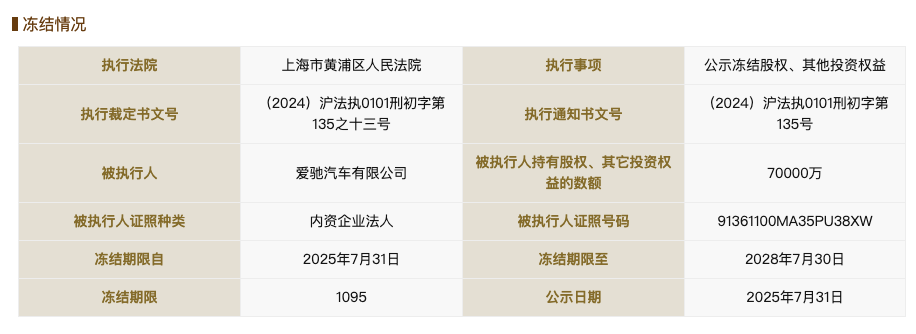 国家企业信用信息公示系统网站显示,7月31日,爱驰汽车有限公司新增一则股权冻结信息,股权所在企业为上海爱驰亿维汽车销售有限公司,冻结股权数额7亿人民币,冻结期限3年,执行法院为上海市黄浦区人民法院。
