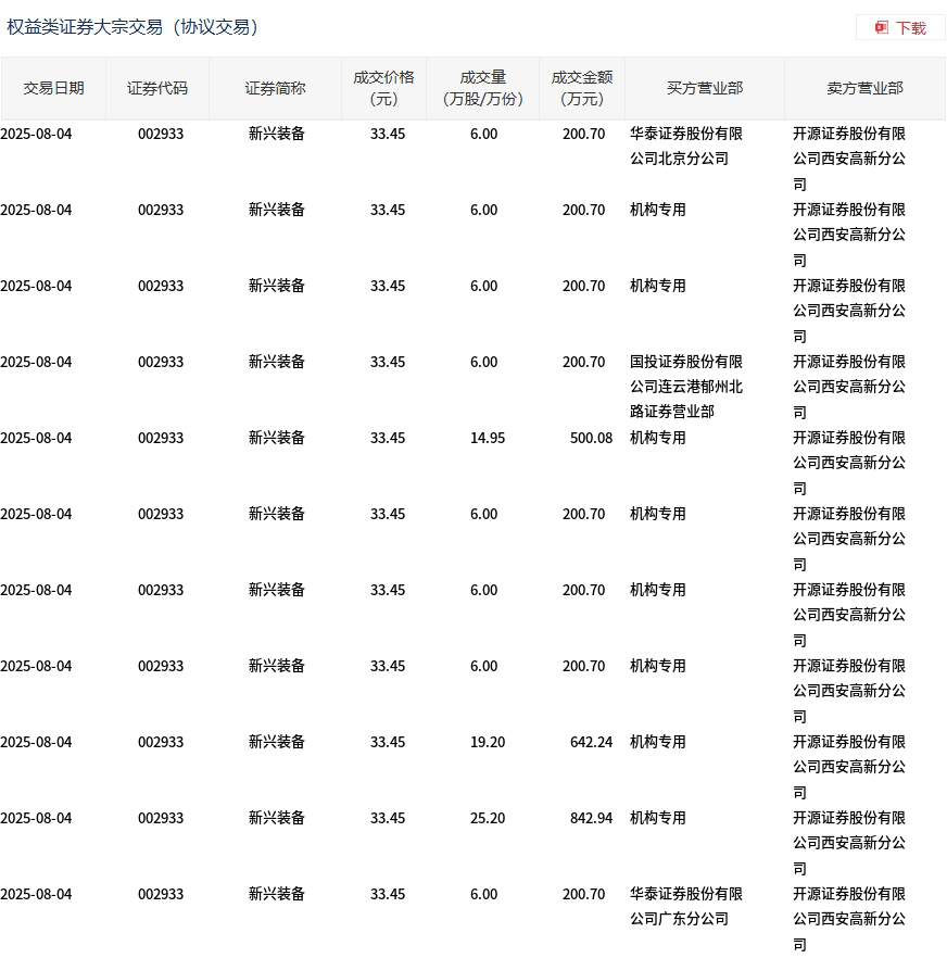 8月4日,新兴装备大宗交易成交107.35万股,成交额3590.86万元,占当日总成交额的9.7%,成交价33.45元,较市场收盘价37.5元折价10.8%。