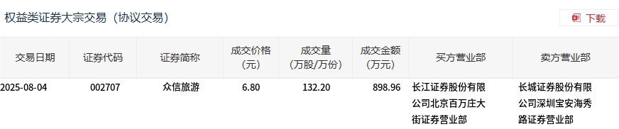 8月4日,众信旅游大宗交易成交132.2万股,成交额898.96万元,占当日总成交额的8.01%,成交价6.8元,较市场收盘价7.56元折价10.05%。