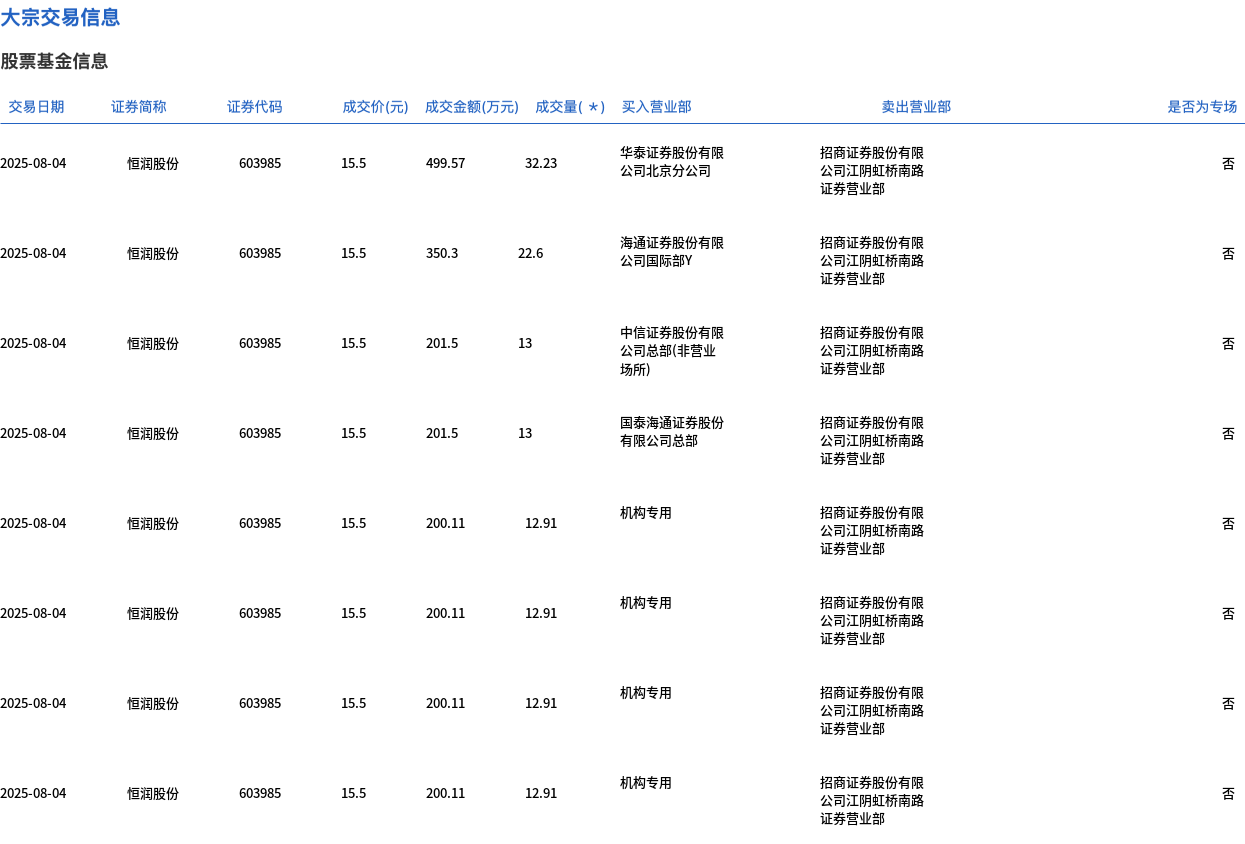 8月4日,恒润股份大宗交易成交132.47万股,成交额2053.31万元,占当日总成交额的7.43%,成交价15.5元,较市场收盘价17.18元折价9.78%。