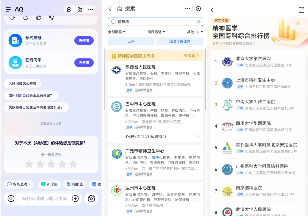 一个被AI重塑的就医路径就这样诞生了:用户在感到不适时,先可在AQ咨询。若为轻症,AQ直接给出建议;若复杂或重症,或用户需要线下就诊,AQ根据距离、科室、医生等需求推荐医院并完成导诊、分诊。之后还能协助支付和医保报销。
