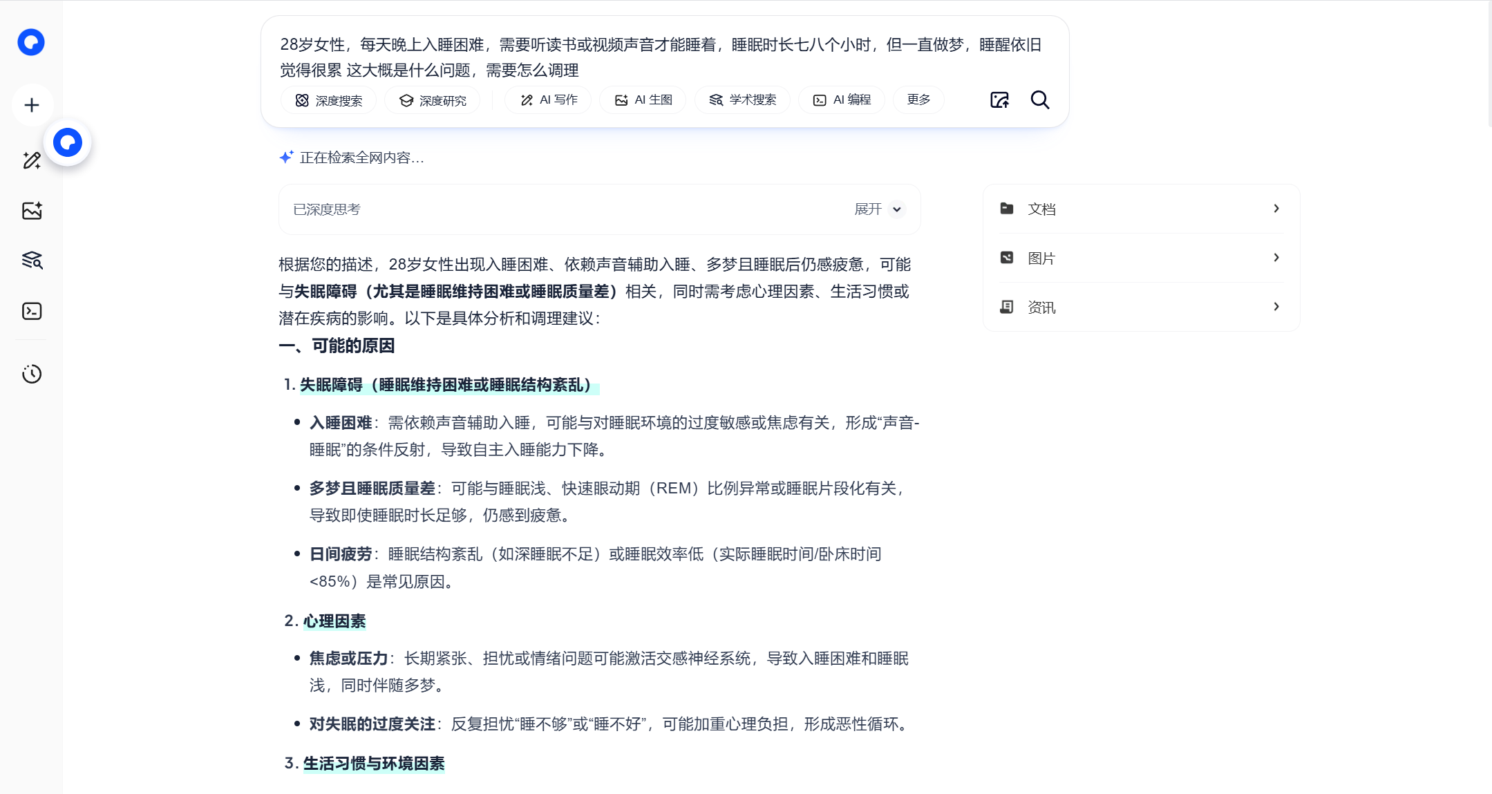 正式进入AI健康咨询阶段。当我输入我的问题后,AQ启动深度思考模式,快速生成了一份结合医学文献的初步报告。内容涵盖了可能的病因分析、生活方式建议和调理方案,并且严谨地在每条建议后附上了文献出处。