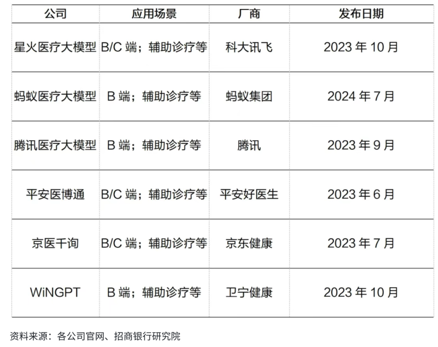 腾讯于2023年9月上线“腾讯医疗大模型” ,发力智能导诊、电子病历等;京东健康依托其在医药供应链和互联网医疗领域的既有优势,于2023年7月发布了模型“京医千询”,补全其服务生态的AI能力 ;平安好医生作为保险巨头平安集团旗下的医疗健康平台,推出平安医博通,探索“医疗+保险”的协同模式;科大讯飞发布“星火医疗大模型”等,旗下“智医助理”率先通过了国家执业医师资格测试……