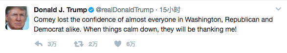 “科米已经失去了华盛顿几乎每个人对他的信任,无论是共和党人还是民主党人。等事态降温以后,他们会感谢我!”