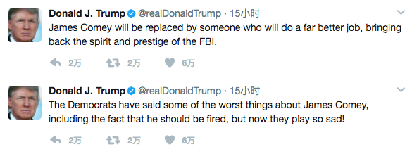 “民主党人说了科米许多坏话,包括他应该被撤职,但现在他们却扮起了伤心!”