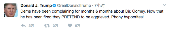 “民主党一直在抱怨科米。现在他被解职了,他们却假装悲伤。虚伪的伪君子!”