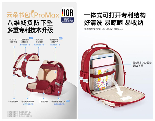 为了满足不同学龄段孩子的需求,卡拉羊品牌精心构建了完善的产品链:从可爱的幼童包,到适合短途出行的游学包,再到5维防下坠减负的大嘴书包、6维防下坠减负的立体方包、7维防下坠减负的气囊书包和8维防下坠减负的云朵书包ProMax…… 纵向覆盖各成长阶段,横向提供丰富选择,让每个孩子都能找到既喜欢又合适的那一款。