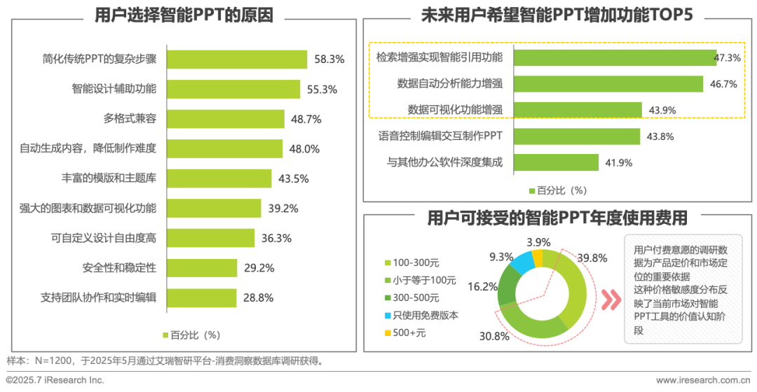 调研数据显示,用户需求已从简单的“效率提升”转向“全流程智能化支持”,特别是在智能引用、数据自动分析与可视化方面表现出强烈期待。随着基础需求的满足,用户期待正在向更专业、更智能的方向演进。未来,这些高级功能预示着智能PPT将从“制作工具”向“决策辅助系统”转型。其次,智能PPT市场的商业化路径正在逐渐清晰,数据显示100-300元的年度使用费用是用户接受度最高的价格区间,占比达到39.8%;其次是≤100元的区间,占比30.8%,为厂商提供了细分市场的战略蓝图。