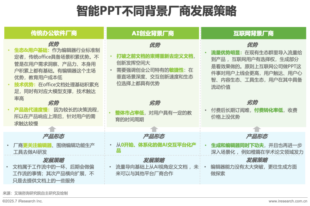 AI技术的加持主要表现在内容生成指令遵从、多模态融合、交互方式等方面全面提升智能PPT水平。场景端的本质变化是PPT从“功能型工具”转变为“业务流内容中枢”,其竞争维度已从工具易用性升级为生态整合能力。厂商可从构建开放的内容API体系,吸引非传统合作伙伴(如SaaS服务商、垂直内容平台)共同开发场景。