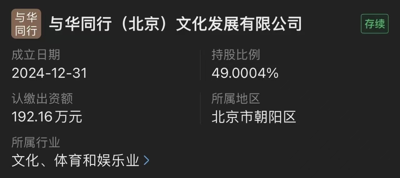 但要追溯WAKUKU的爆红节点,主要有两个。一是2024年12月31日Lestvan与乐华娱乐关联公司天津壹华,合资成立了与华同行公司,分别持股49%和51%,合资公司法定代表人正是乐华娱乐执行董事兼总裁孙一丁。