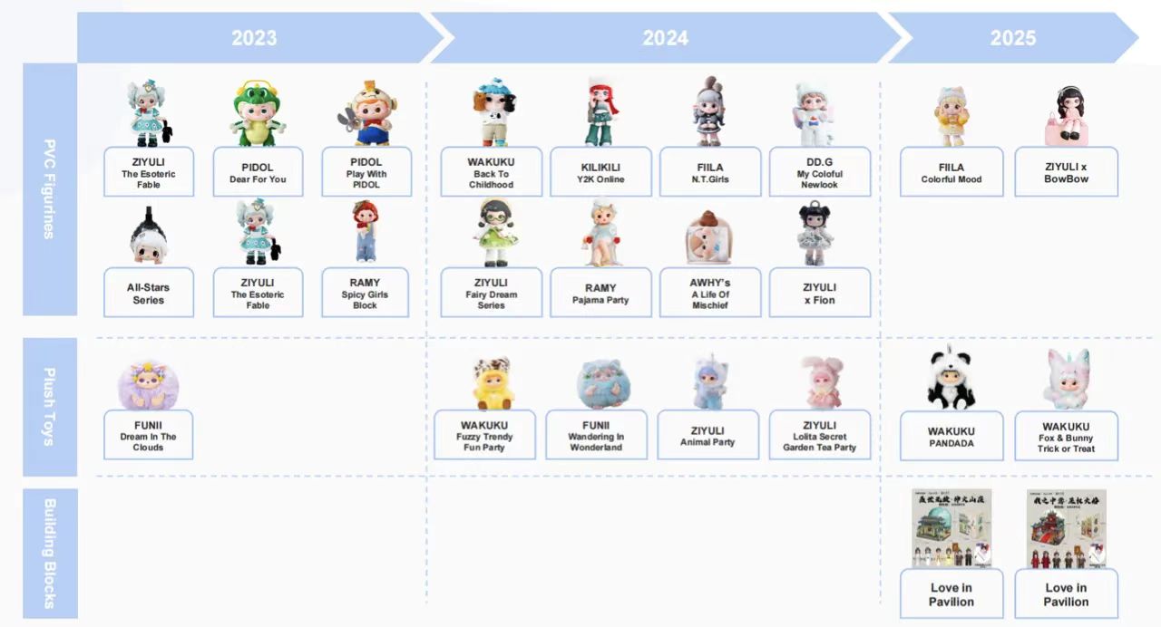 根据量子之歌最新披露的信息,Letsvan目前的IP版图包括又梨、WAKUKU、SIINONO等15个IP,其中WAKUKU在2024年底推出后得到市场认可,在明星宣传带动下成为潮玩新品。