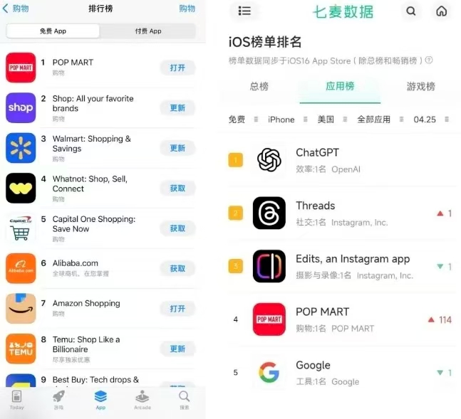 期间,也就是今年4月,LABUBU3.0线上24日发售,线下25日发售。产品在欧美地区的抢购热潮,成为了POP MART 登顶美国App Store购物榜的核心原因。自这次首次登顶后,POP MART App就成为了这个榜单常客。