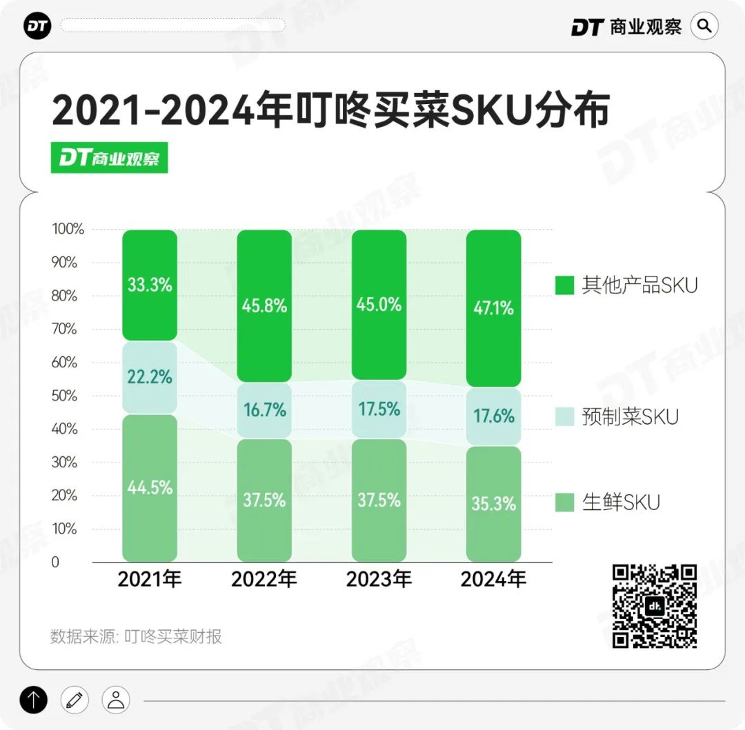 叮咚买菜也在增加非生鲜标品的占比。2021年-2024年,叮咚买菜生鲜SKU从44.5%降至35.3%,2024年非生鲜类标品占比64.7%,其中预制菜占比17.6%,其他标品占比47.1%。
