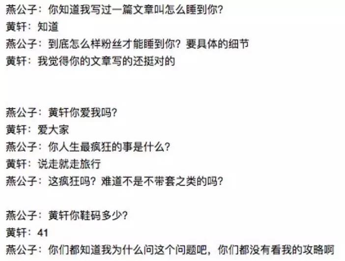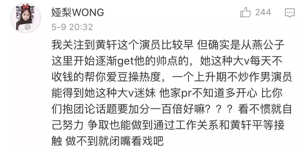 微博底下燕公子的粉丝齐刷刷:黄轩自己都没尴尬,你们一群粉丝激动什么?黄轩巴不得被燕公子这样的流量大户带热度呢。