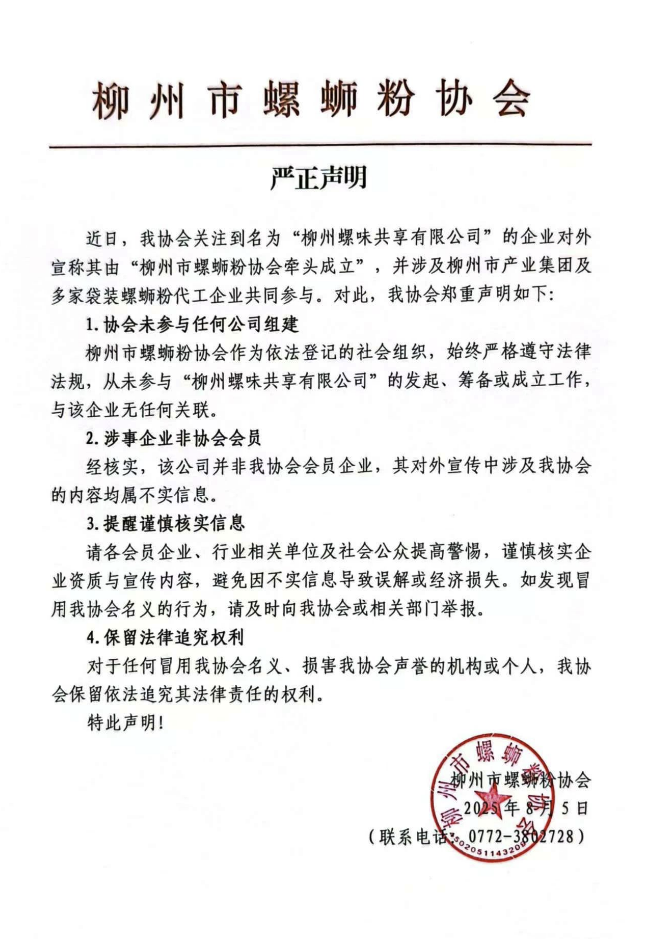 8月5日,柳州市螺蛳粉协会发布声明称,协会关注到名为“柳州螺味共享有限公司”的企业对外宣称其由“柳州市螺蛳粉协会牵头成立”,并涉及柳州市产业集团及多家袋装螺蛳粉代工企业共同参与。柳州市螺蛳粉协会作为依法登记的社会组织,始终严格遵守法律法规,从未参与“柳州螺味共享有限公司”的发起、筹备或成立工作,与该企业无任何关联。经核实,该公司并非协会会员企业,其对外宣传中涉及我协会的内容均属不实信息。