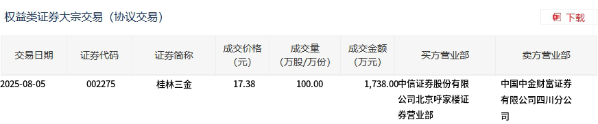 8月5日,桂林三金大宗交易成交100万股,成交额1738万元,占当日总成交额的4%,成交价17.38元,较市场收盘价17.38元持平。