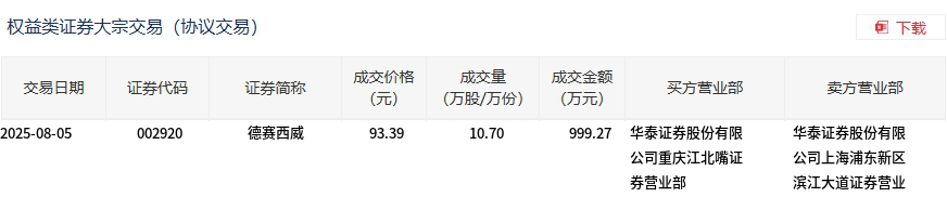 8月5日,德赛西威大宗交易成交10.7万股,成交额999.27万元,占当日总成交额的1.93%,成交价93.39元,较市场收盘价103.31元折价9.6%。