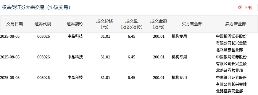 8月5日,中晶科技大宗交易成交19.35万股,成交额600.03万元,占当日总成交额的7.02%,成交价31.01元,较市场收盘价34.72元折价10.69%。