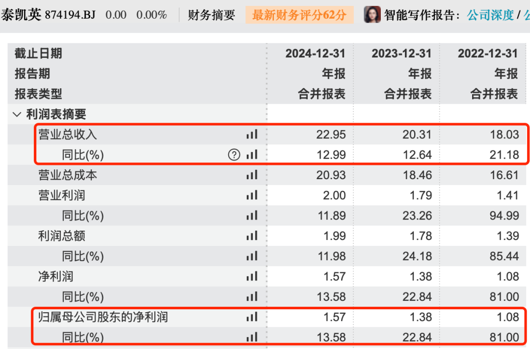 报告期内,泰凯英的营业收入分别为18.03亿元、20.31亿元和22.95亿元,同比增长21.18%、12.64%和12.99%。