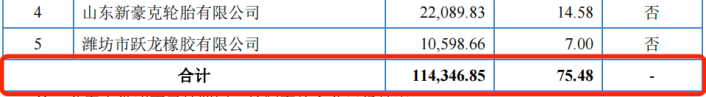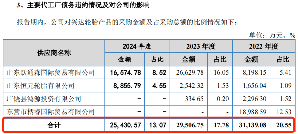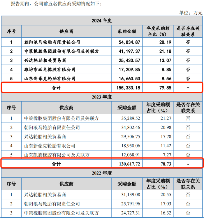 报告期内,泰凯英对兴达轮胎的采购额分别为3.11亿元、2.95亿元和2.54亿元,占采购总额的比例分别为20.55%、17.78%和13.07%,三年累计采购额高达8.6亿元。