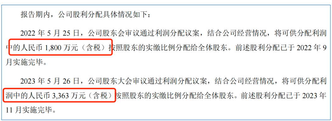 递表前夕,泰凯英连续两年进行了分红。2022年和2023年,公司股利分配金额分别为1800万元和3363万元,共计5163万元。按照王传铸、郭永芳夫妇的持股比例计算,大部分都落入了夫妻二人的“口袋”。