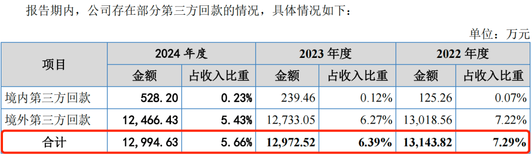 2022年至2024年(以下简称“报告期”),公司第三方回款金额分别为1.31亿元、1.30亿元和1.30亿元,占当期营业收入的比例分别为7.29%、6.39%和5.66%。
