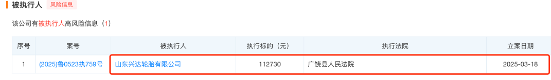 天眼查显示,2025年3月,兴达轮胎被列为被执行人,执行标的为11.27万元。此外,兴达轮胎还被列为限制高消费企业。
