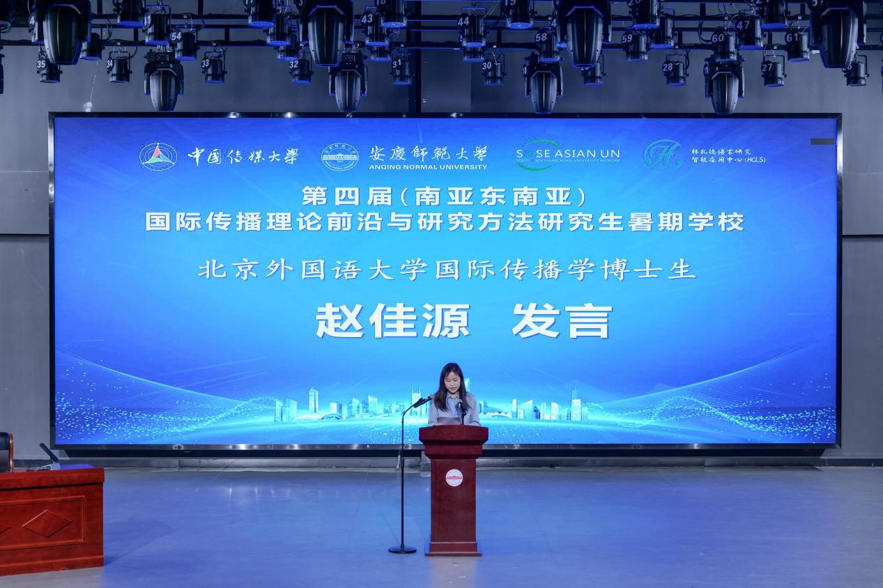 北京外国语大学国际传播学博士生赵佳源作为学员代表发言,向本次暑期学校的主办方表达感谢,并结合自身的学习实践经历,分享了对于中国共产党海外形象传播的研究感悟。