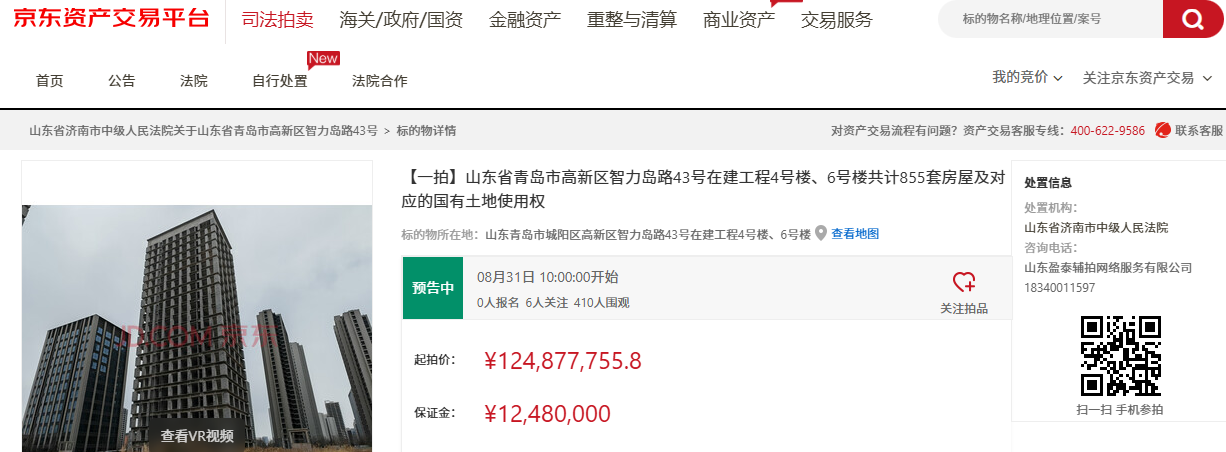 此次拍卖标的位于青岛市高新区智力岛路43号,涉及4号楼、6号楼两栋在建工程,总建筑面积40099.53平方米。项目自2018年开工后即陷入停滞至今。开发方青岛中腾双创置地有限公司已被列为失信被执行人,其票据持续逾期情况在上海票据交易所公示系统中可查。