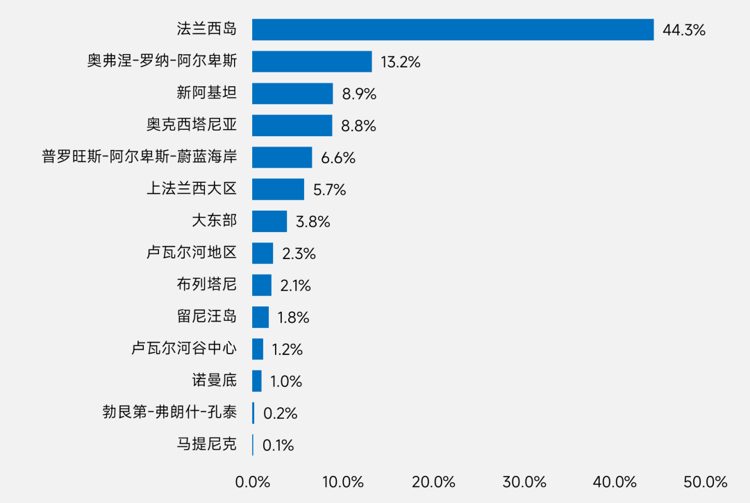 从地域分布来看,法国游戏产业地域集中化特征显著,巴黎大区(法兰西岛,首都巴黎所在区域)为法国游戏产业贡献48亿欧元年产值,聚集了41.5%的从业人员、44.3%的游戏公司。