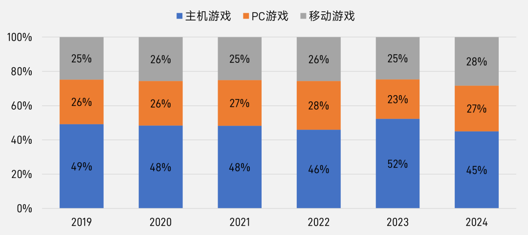 2024年,法国主机游戏市场份额为45%,虽份额下滑,但仍是法国游戏市场的基石,PC游戏和移动游戏市场份额相当,但从2023年起移动游戏超越PC游戏成为第二大细分市场。