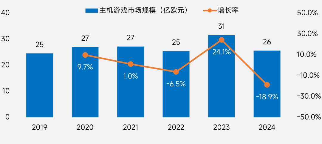 2024年,法国主机游戏市场规模(含硬件)达到26亿欧元,同比下降18.9%。受疫情影响,不少精品大作(如《霍格沃茨之遗》《博德之门3》等)推迟到2023年集中上市,导致2023年市场规模达到历史峰值,首次突破30亿欧元,拔高了整体市场基数。