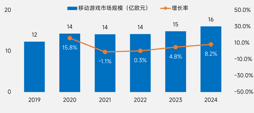 2024年法国移动游戏市场规模达16亿欧元,同比增长8.2%,已连续四年保持增长,正处于较快发展期。这主要得益于超休闲游戏的爆发,和女性玩家以及“银发玩家”的增长。