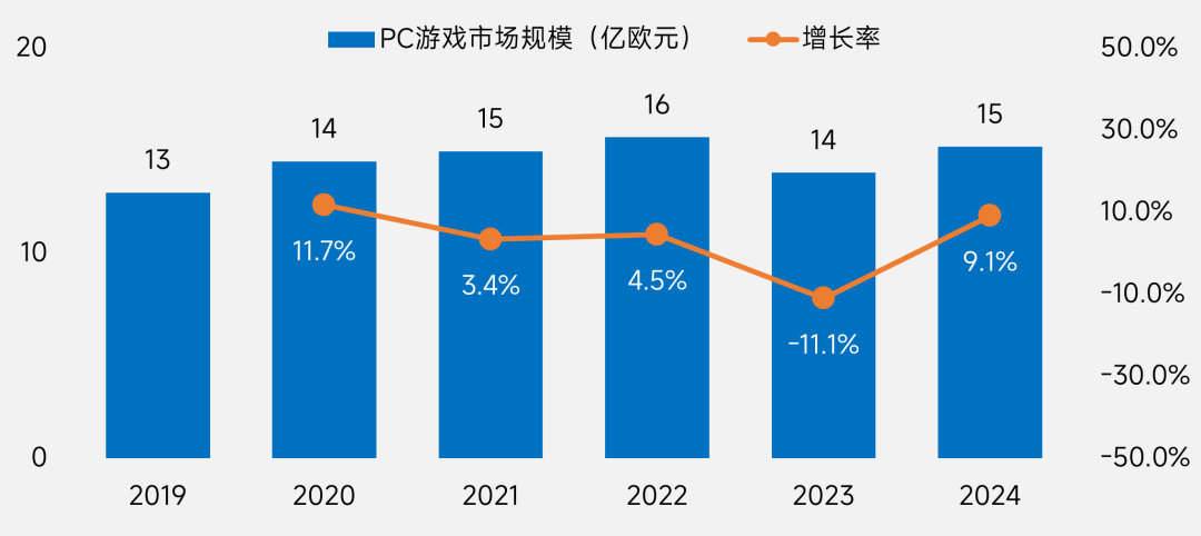 2024年,法国PC游戏市场规模达到15亿欧元,同比增长9.1%,主要是依靠消费者硬件(+12%)和配件(+27%)更新带动增长,PC软件同比减少3%,整体市场规模稳定。