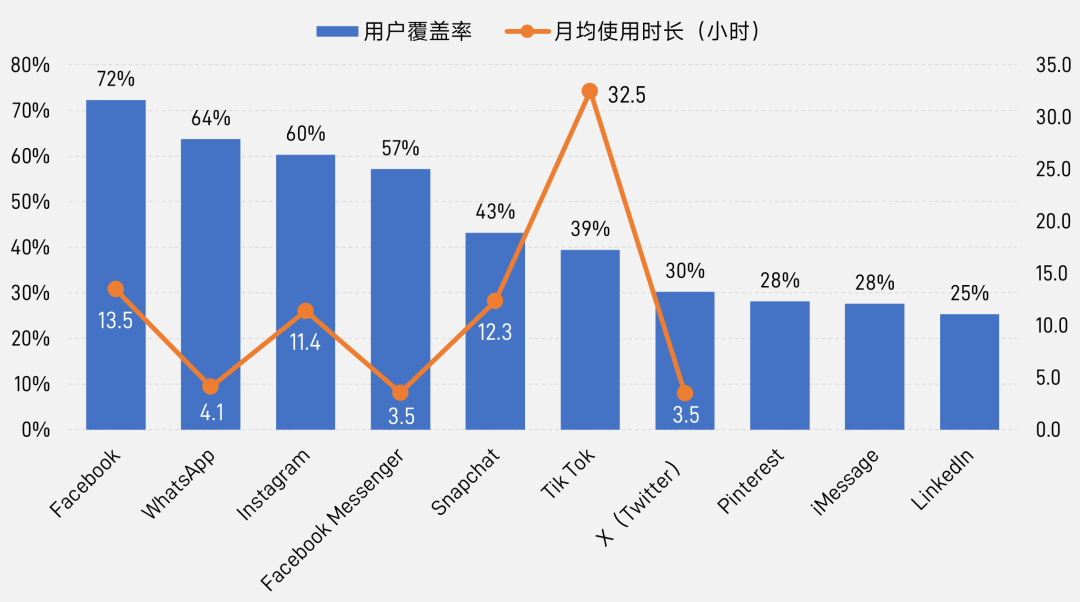 法国玩家主要聚集在于Facebook系社交媒体,值得注意的是,Tik Tok虽然仅覆盖了约四成用户,但月均使用时长高达32.5小时,是Facebook的2.4倍,这表明用户更愿意花时间在短视频平台,对于出海开发者来说,Tik Tok是一个值得投入资源的重要推广平台。