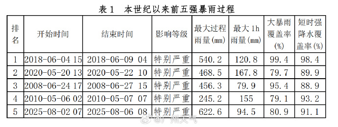 据广州市生态与农业气象中心监测,8月2日至6日出现今年以来最强暴雨过程,已经达到特别严重影响等级,为8月最强暴雨过程,本世纪以来第5强。