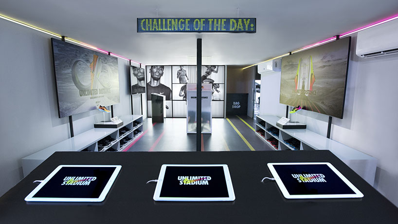 耐克把它称为“无限运动场”(unlimited stadium),它最大的卖点也不是球鞋的外形,而是沿着全长200米的跑道耐克设立了一道由千万个LED组成的跑步屏幕。参与机制大概是这样的:跑步者出发前设定好自己跑一圈的目标时间,然后在自己的耐克鞋上装上传感器。当你开启自己的跑步计划时,LED屏幕上便会出现一个虚拟的对手,它的速度会根据你的实际速度和预期目标时间来调整,让你可以通过赶超它来实现自己的跑步计划。